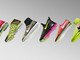 Гипер-розовый, смешиваясь с цветом вольт в середине стопы и насыщая цвет по мере приближения к подошве, оптически напоминает очертания неукротимого бегуна. Цвета гармонично сочетаются с металлическими шипованными пластинами, как у панцирей жуков, что вспыхивают цветами драгоценностей – серебром, пурпуром и бирюзой.